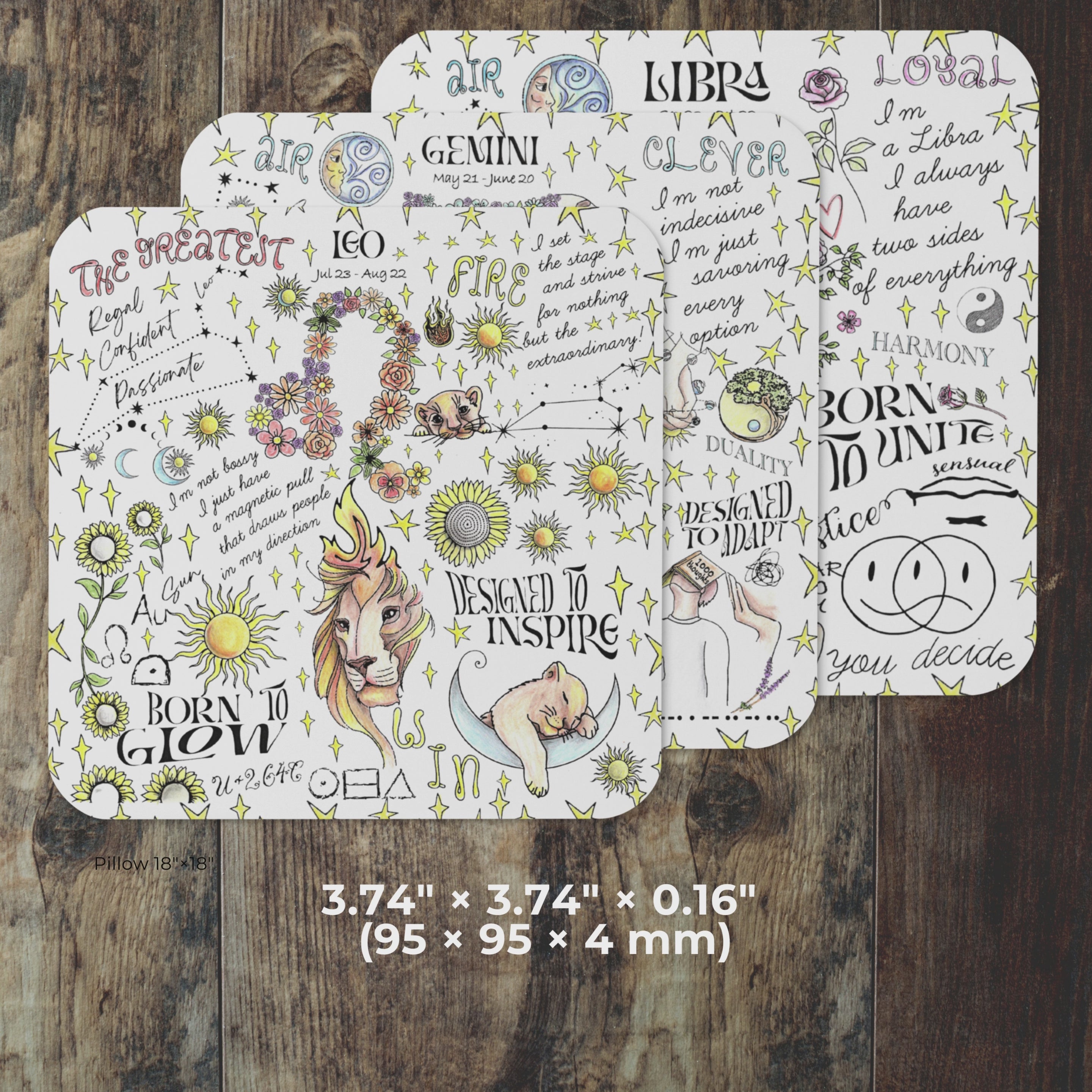 Whimsical Zodiac coaster set featuring 12 star signs, perfect for astrology enthusiasts and celestial home decor. Ideal as a cool birthday gift for women or a thoughtful Mother's Day gift, with designs for Pisces, Aries, and more.