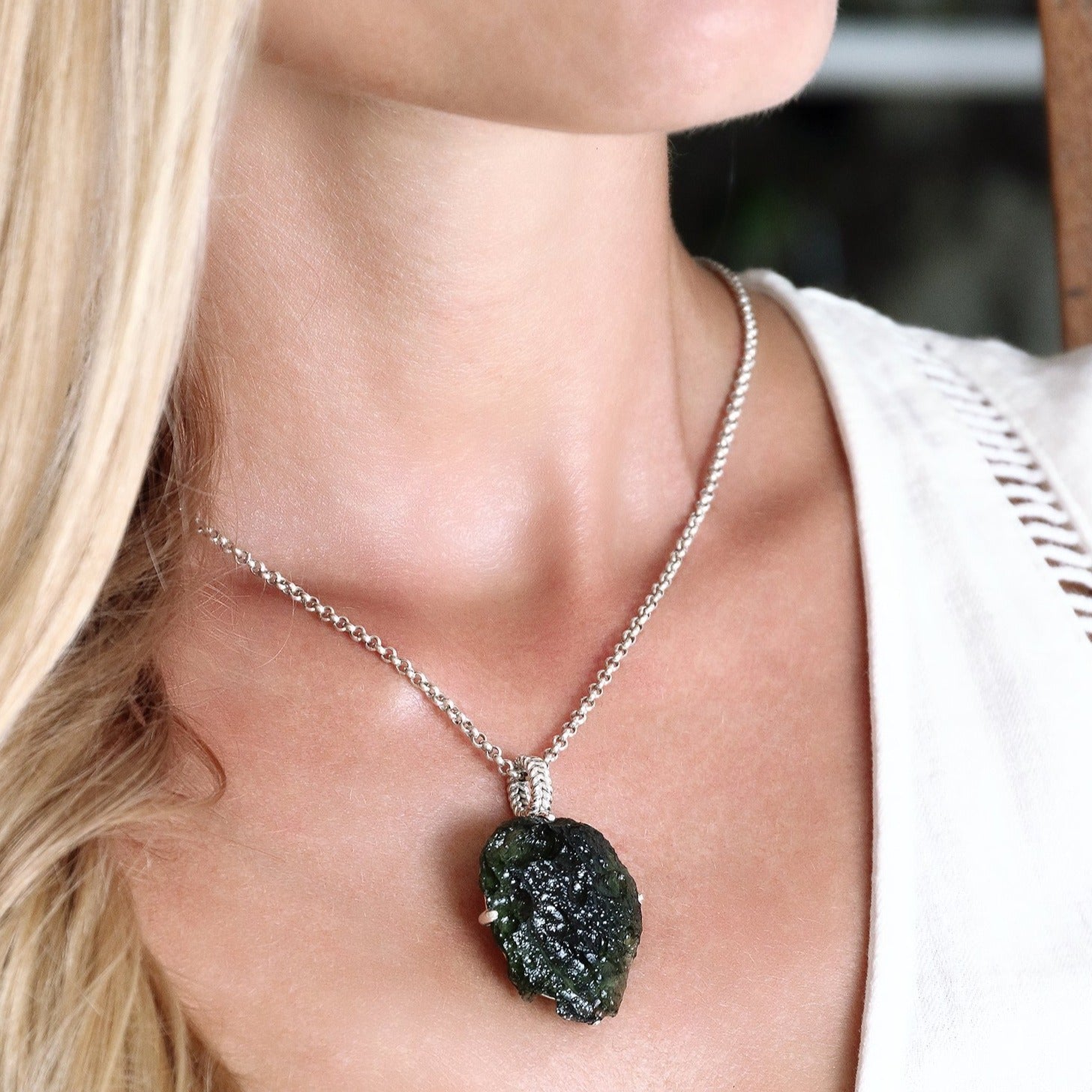 Moldavite gems are shaped by nature itself. Each one has a fascinatingly unique shape. Have your own moldavite set in a sterling silver pendant. Be amazed as it glistens in its raw beauty while light passes through the open-back pendant.