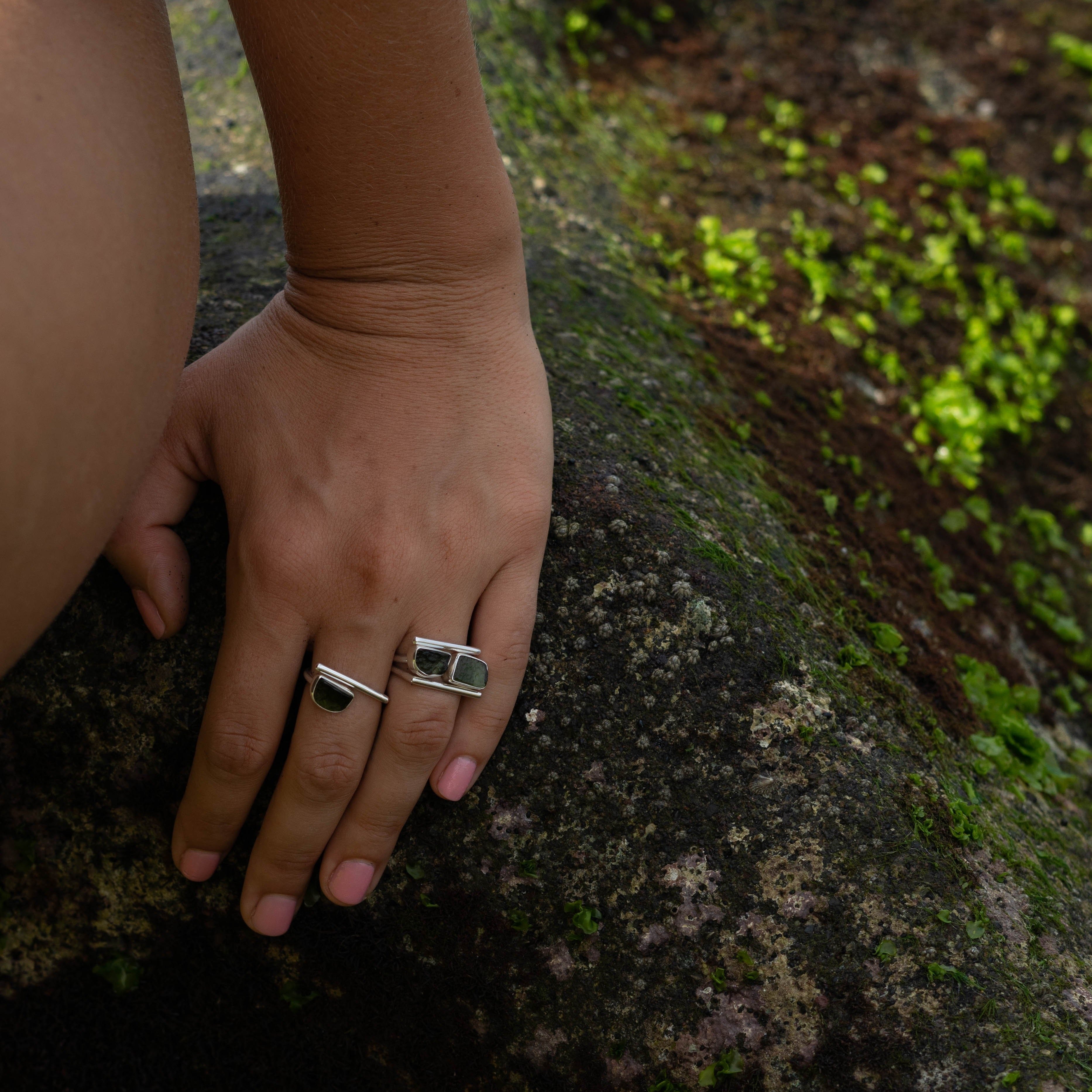 This single moldavite sits majestically atop a carefully hand-shaped sterling silver ring. Its raw beauty and imposing power seem drawn from the depths of the earth itself. Unrefined yet elegant at the same time. The adjustable ring is carefully hand-shaped from 925/1000 Italian sterling silver and is made to last a lifetime.